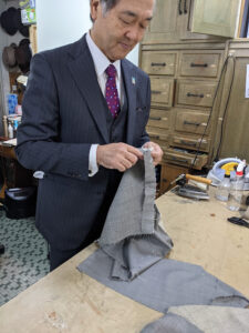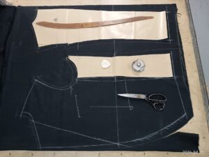 仮縫いした生地をまたバラバラにほどき、補正線を引き直して、今度は本式に縫い合わせます。仮縫いからお引き渡しまで、もう2週間ほどお待ち下さい。